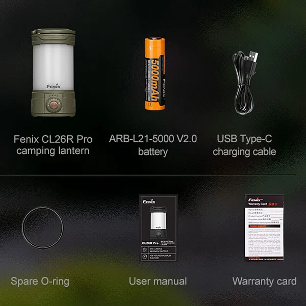 - Комплектация: фонарь CL26R Pro, запасное уплотнительное кольцо, аккумулятор ARB-L21-5000 V2.0 Li-ion, кабель для зарядки, инструкция, упаковка: