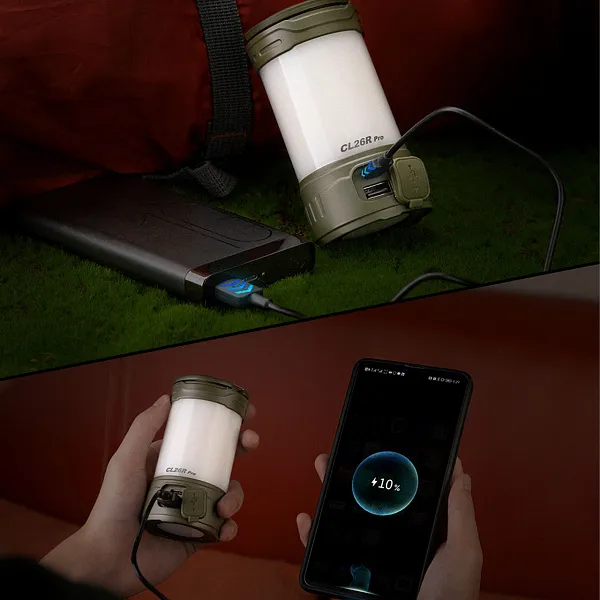 Кемпинговый фонарь Fenix CL26R Pro - светодиодный перезаряжаемый фонарь для кемпинга и походов на светодиодах нейтрально-белого цвета и дополнительного красного цвета максимальной мощностью 650 люмен.Управление фонарем осуществляется по средству думблера, чтобы выбрать девять различных режимов освещения, включая максимум 500 люменов, которые могут освещаться на 360 ° на расстоянии до 15 метров. В комплекте с фонарем поставляется аккумулятор 21700 Fenix ARB-L21-5000 V2.0 5000 мАч и USB шнур Type-C для зарядки аккумулятора через встроенный порт USB, который защищен резиновой заглушкой и оснащен индикацией заряда аккумуляторной батареи. Фонарь оснащен встроенной петлей для подвеса фонаря, а так же удобным магнитным креплением. Идеально подходит для военных, правоохранительных органов, охоты, туризма, поисковых и спасательных работ. Имеется магнит для крепления к железным поверхностям.