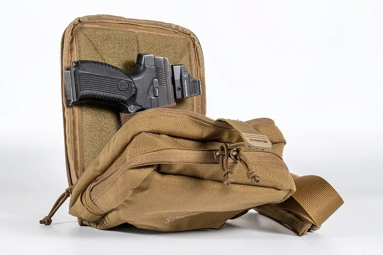 - Система быстрого доступа к оружию с хлястиком и бесшумным фиксатором «испанская пряжка» для раскрытия сумки на 180°.